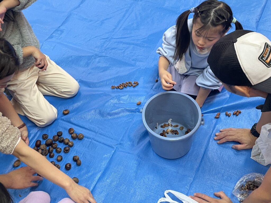 採取したどんぐりを水に浮かべて選別します。