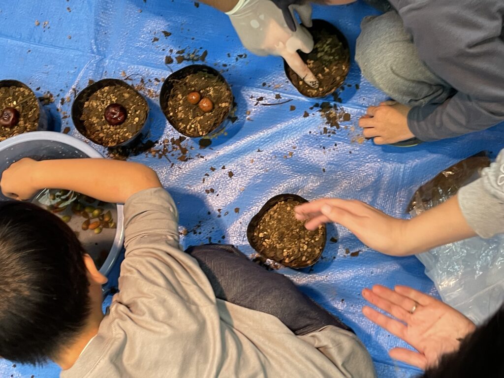 種類ごとに、1つの苗に2~3個のどんぐりを植えます。